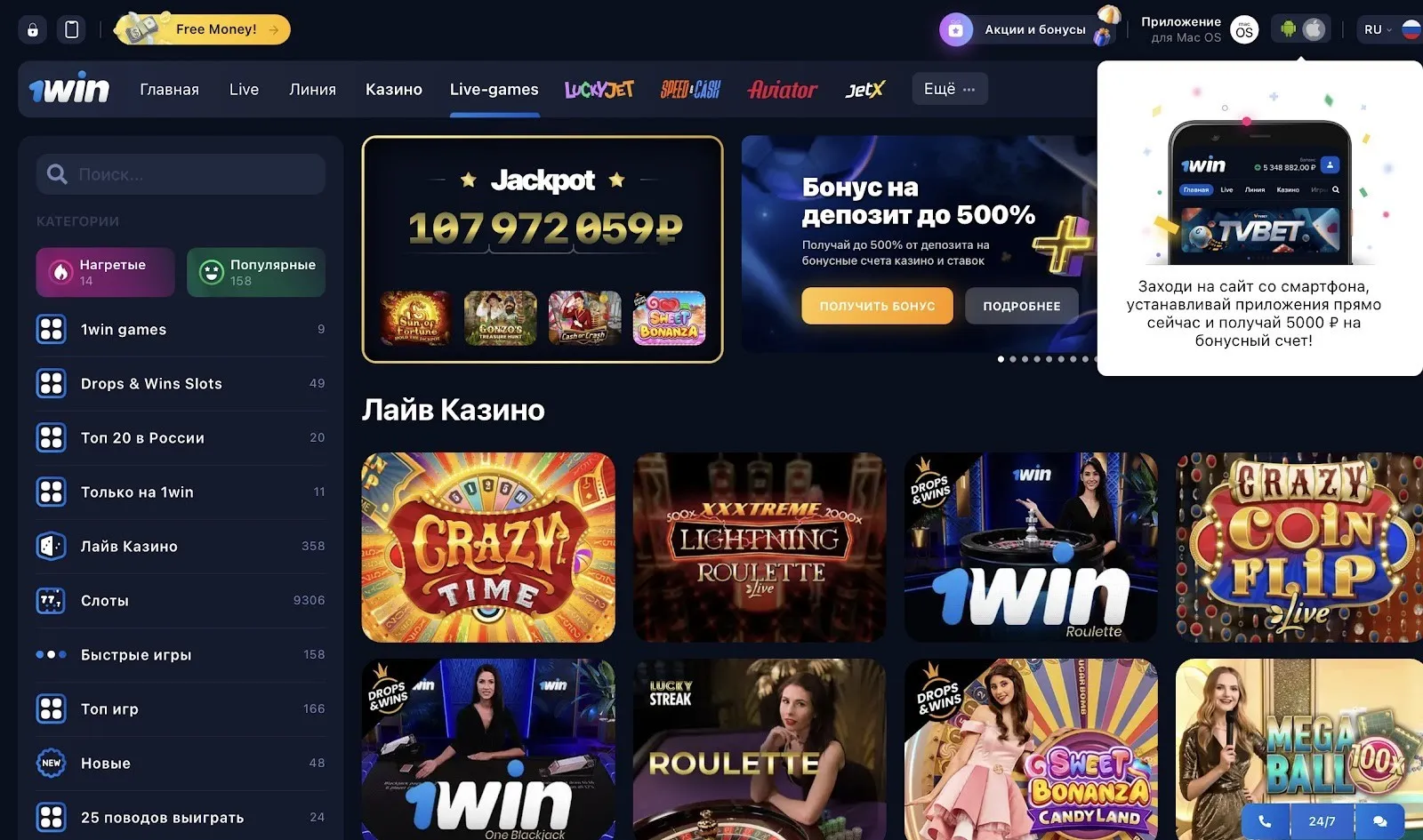 - Функциональная витрина казино. Этот раздел оператор развивает особенно интенсивно. Игрокам доступны краш-игры, а также тысячи игровых аппаратов.